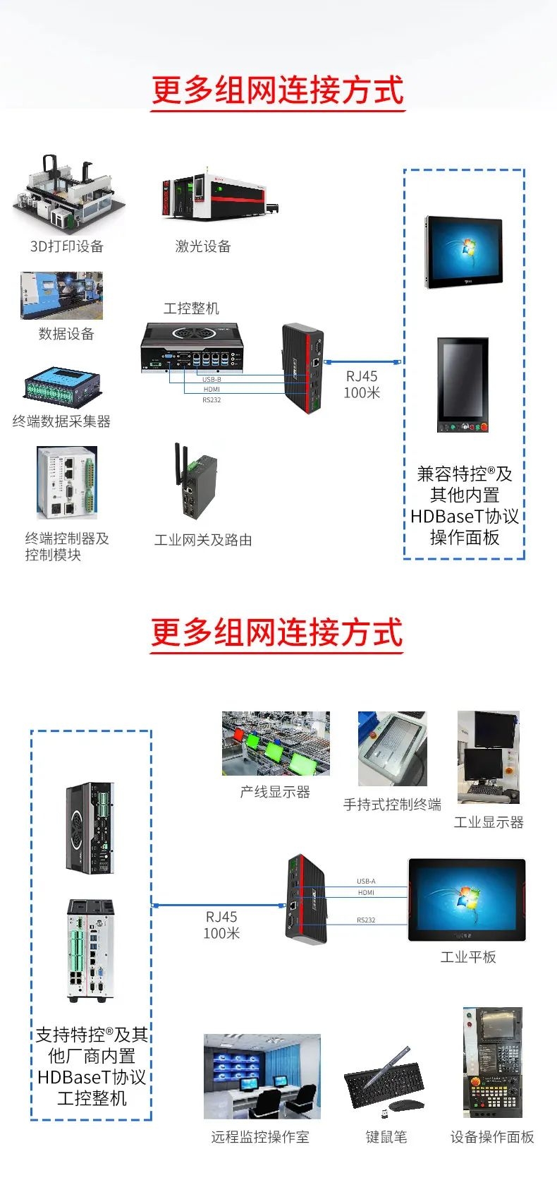 在大型裝備、自動(dòng)化產(chǎn)線、激光及數(shù)控行業(yè)等需要遠(yuǎn)距離信號(hào)傳輸場(chǎng)景中,傳統(tǒng)HDMI線纜存在信號(hào)衰減、傳輸距離限制、布線不便等問(wèn)題,這極大地影響顯示端的成像質(zhì)量和雙向數(shù)據(jù)的穩(wěn)定性和時(shí)效性。為此,特控研發(fā)出抗干擾性強(qiáng)、數(shù)據(jù)零延時(shí)、兼容性強(qiáng)的HDMI星光遠(yuǎn)傳ECU-TR12。特控ECU-TR12采用進(jìn)口高性能芯片設(shè)計(jì),總體由發(fā)射端T12和接收端R12兩部分組成,發(fā)射端可將2.5k高清視頻信號(hào)、USB和RS232數(shù)據(jù)信號(hào)進(jìn)行整合,通過(guò)標(biāo)準(zhǔn)網(wǎng)線(CAT6)遠(yuǎn)距離傳輸?shù)浇邮斩?,無(wú)信號(hào)衰減,接收端通過(guò)高性能智能芯片解碼,可以給用戶高速高質(zhì)量的數(shù)據(jù)及顯示交互體驗(yàn),整機(jī)外殼采用鋁合金散熱設(shè)計(jì),機(jī)身堅(jiān)固小巧獨(dú)具工業(yè)美感,可搭配行業(yè)通用HDBeasT協(xié)議設(shè)備使用,包括內(nèi)置協(xié)議的HMI操作端、工業(yè)顯示平板、工業(yè)PC及終端采集設(shè)備。